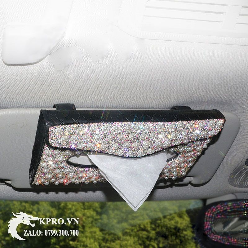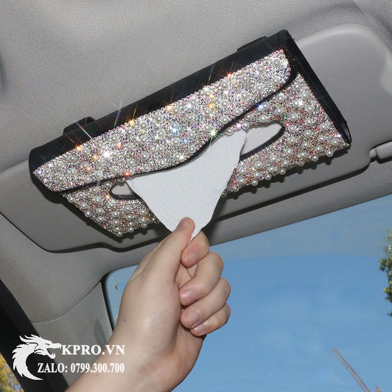 Hộp khăn giấy treo đính đá gắn tấm che nắng, để taplo xe hơi, bàn học, bàn làm việc